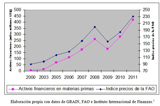 Desde entonces el mundo vive en tensión debido al incremento de los precios de los alimentos que originó una crisis alimentaria en 2008 y otra inacabada en 2010 que está causando estragos en el Cuerno de África y el Sahel. Desde el principio se intentó esconder el motivo real de las crisis y se argumentó que la causa era el desequilibrio en la oferta y la demanda de alimentos, aunque con el tiempo y ante los hechos la realidad se hizo visible. Como se ve en la gráfica, existe una relación palpable entre la actividad inversora y el incremento de precios. Y la realidad es que mientras en el África Subsahariana está muriendo gente de hambre, el grupo de inversión Goldman Sachs ganó más de 5.000 millones de dólares en 2009 especulando en materias primas, lo que supuso un tercio de sus beneficios netos6.
