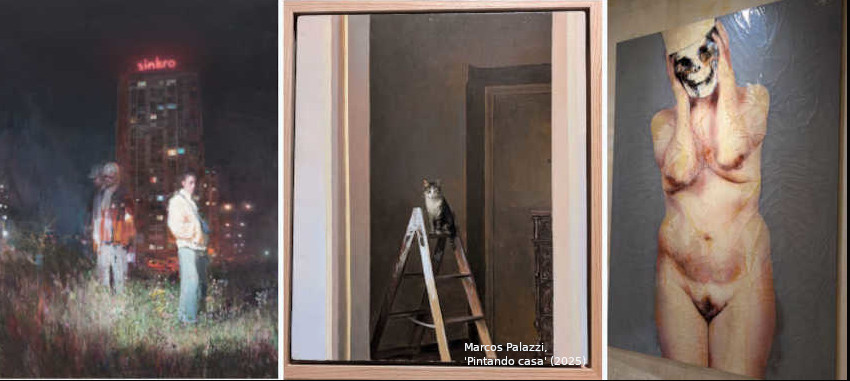 De Nadezda, artista multidisciplinar y profesora de composición, se puede contemplar ‘Finishing with the Meowoman’ (2019); y Marcos Palazzi, en su estudio de Barcelona reproduce escenas cotidianas que reflejan su sentido del humor, como en ‘Pintando casa’ (2025).