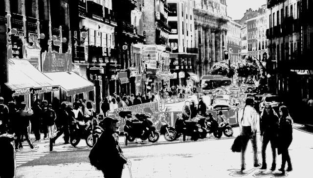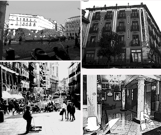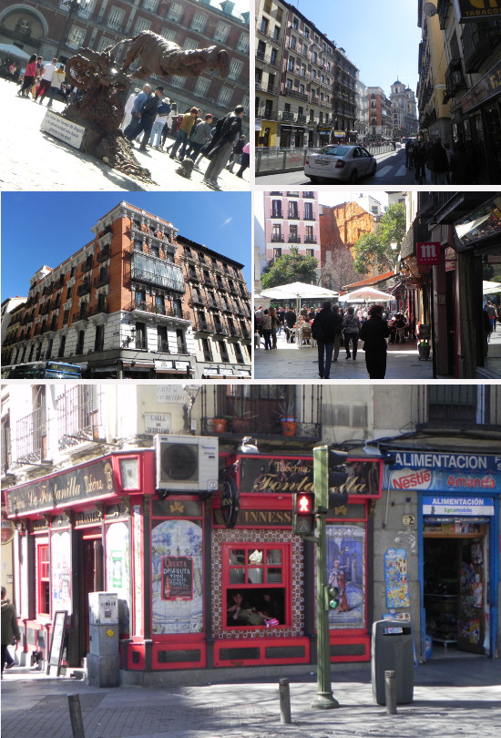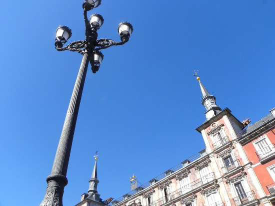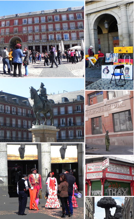 Al día siguiente nos emplazamos en la Plaza Mayor, centro neurálgico donde se juntan los madrileños aprovechando su tiempo libre, entretenidos ante las imposibles posturas de las estatuas vivientes; los turistas inmortalizados por la cámara como bailaoras o toreros; los niños boquiabiertos ante la cabra que luce un pelaje insólito o el hombre invisible que departe amigablemente con quien desea una fotografía junto a él. Bajo los blancos parasoles de los bares, pululan los camareros con sus bandejas en equilibrio a veces mágico y los vecinos de las casas circundantes aprovechan la calidez del día para, a su vez, observar a los paseantes que, cámaras en ristre, se llevan convertidas en bits las pinturas de las fachadas o la imagen de un artista callejero.