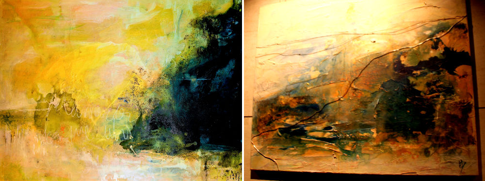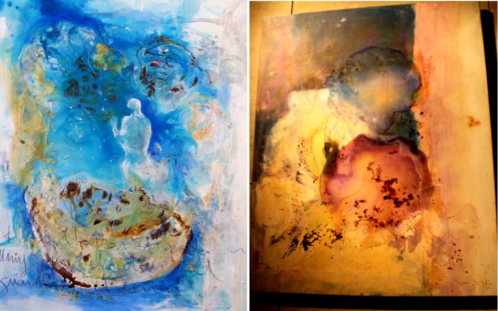 En cada cuadro hay detrás muchas semanas de trabajo. La artista mezcla diferentes sustancias que deja luego en reposo y vuelve sobre la obra hasta que siente que el cuadro está acabado.