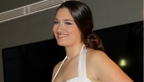 La novia que ha servido de modelo, una bella mujer curvy, con un pecho no excesivamente voluminoso, pero con caderas pronunciadas, vestía un modelo con corpiño ajustado cogido en la nuca con una falda con volumen medio realizada con una tela muy liviana con gran caída.