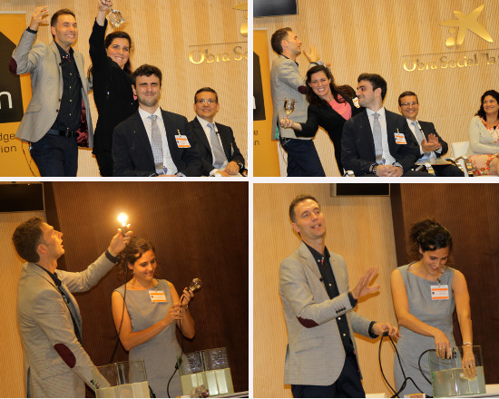 El segundo, tratar de enroscar una bombilla dentro de un recipiente con agua sin que pasara la corriente a quien lo hacia. Se ha realizado con éxito ya que el líquido no era agua, sino una solución que no permite, no sólo que no pase la corriente, sino que si le se acerca una cerilla encendida, antes de llegar al líquido, se apaga. Han finalizado los experimentos entre risas y aplausos.