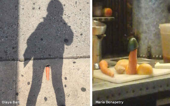 En cualquier momento la sombra cambiará de lugar o desaparecerá, mientras la zanahoria carece de movilidad propia. No nos queda ninguna duda de que la autora nos está forzando a pensar en la relación que pueda existir entre el cuerpo de una mujer y un pene simbólico materializado en una zanahoria.