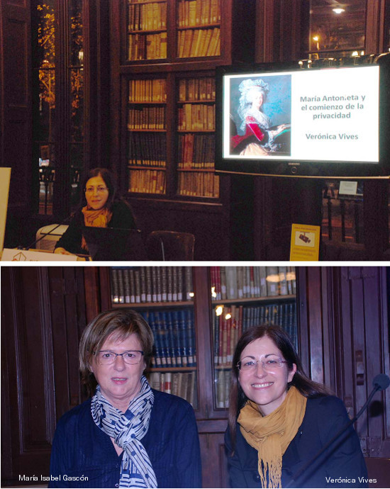 La doctora Vives explica la imposibilidad de abordar la charla sobre esta reina como un ser singular e independiente de su época, ni la de intentar abarcar la totalidad de su personalidad, que sobresale con fuerza por las circunstancias que le fue dado vivir. Por tanto ha titulado su discurso María Antonieta y el inicio de la privacidad. Una privacidad desconocida hasta entonces en el entorno de las cortes europeas. Las vidas de los monarcas eran públicas en sentido estricto; cuanto decían y hacían tenía siempre espectadores, vehículos de transmisión hacia estamentos externos a la vida cortesana. Todos sus actos, incluso aquellos demandados por la fisiología, eran susceptibles de ser mostrados para ser contemplados.