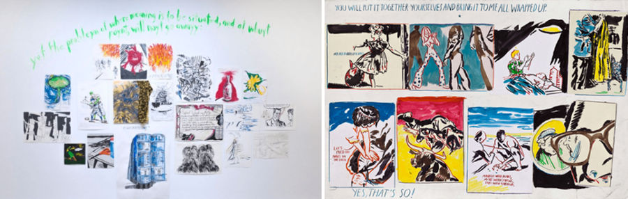 Su obra empieza donde termina la de otros dibujantes de viñetas y cómics, o de artistas del pop art como Roy Lichtenstein. Aunque si bien el dibujo es el arma central en su creación, el texto tiene también un papel destacado, y uno y otro se articulan en un entramado complejo y lleno de matices.