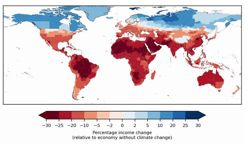 Se prevén fuertes reducciones de ingresos en la mayoría de las regiones, incluidas América del Norte y Europa, siendo Asia meridional y África las más afectadas. El análisis muestra que el cambio climático causará daños económicos masivos en los próximos 25 años en casi todos los países del mundo.