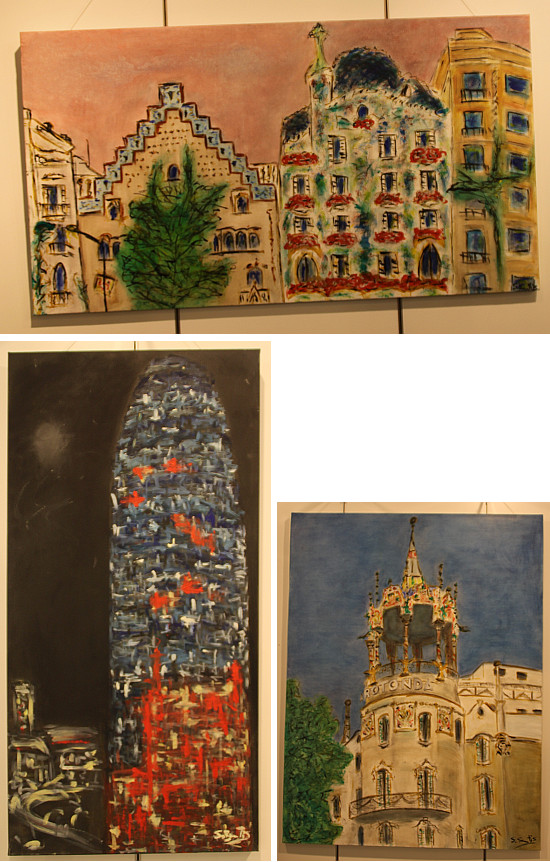 Vemos también obras más figurativas de lugares emblemáticos de Barcelona como la Torre Agbar, el mercado de la Boquería, el MNAC (Museo Nacional de Arte de Catalunya), la casa Batlló, casa Ametller, la Rotonda, las Ramblas, y la ‘Antigua Casa Figueras’, ahora pastelería Escribà.
