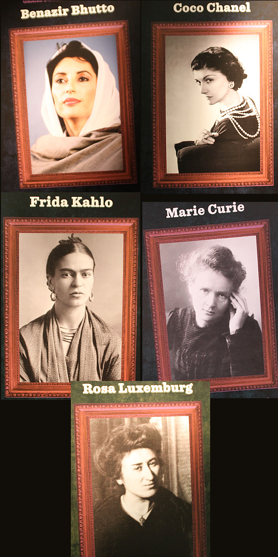 En la galería de ‘Grandes mujeres de la historia’ están: Benazir Bhutto, Coco Chanel, Frida Kahlo, Clara Campoamor, Rosa Luxemburg, Mata Hari, Marie Curie, Jane Austen, Juana de Arco y Cleopatra. Con esta pequeña muestra se quiere celebrar y homenajear la figura de la mujer. Grandes mujeres que han inspirado al mundo y nos han ayudado a todos y a todas.