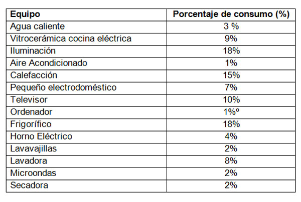 Consumo medio anual de cada aparato eléctrico de una vivienda media (90 metros cuadrados sin identificar la zona geográfica española):