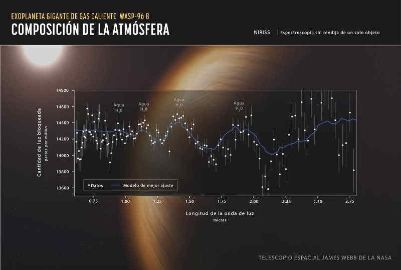 Webb ha captado la señal inconfundible del agua, junto con evidencia de nubes y bruma, en la atmósfera que rodea este gigante gaseoso, caliente e inflado. La observación, que revela la presencia de moléculas de gas específicas, basada en pequeñas disminuciones en el brillo de colores de luz precisos, es la más detallada de su tipo hasta ahora, demostrando la capacidad sin precedentes de este observatorio para analizar atmósferas a cientos de años luz de distancia.