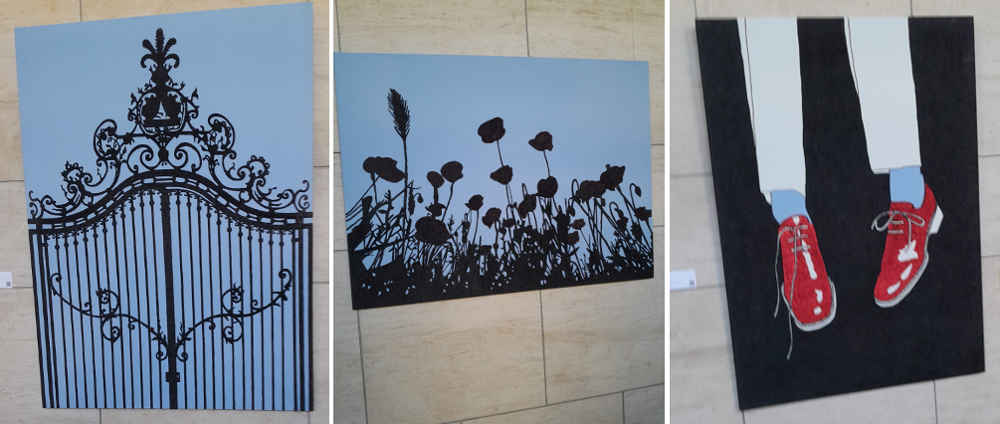 También podemos admirar una serie de obras en las que la narración visual, compuesta por líneas y zonas de color intercaladas con purpurina roja o negra, se expande sobre lienzos. Pinturas como ‘The door’, ‘Poppies’ y ‘Red shoes’, dialogan entre sí de manera enigmática: una verja, unas amapolas y zapatos de purpurina.