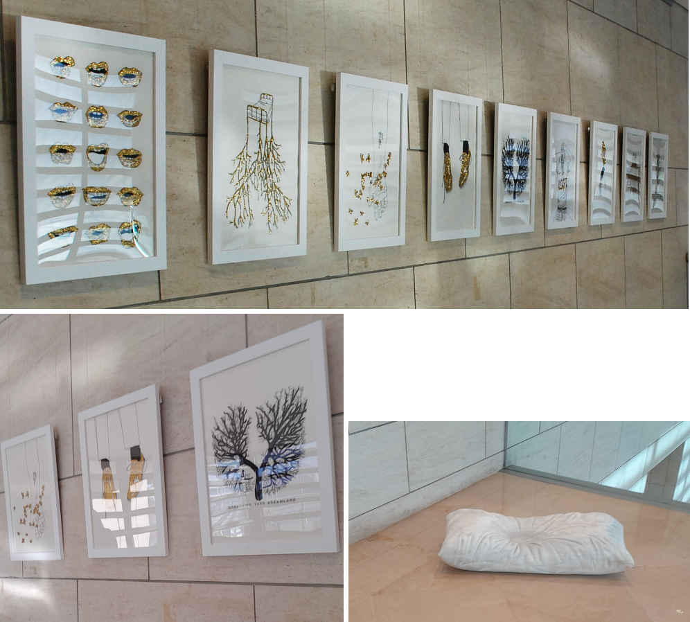 En estos dibujos destacan elementos como mariposas que susurran palabras, arterias que envuelven órganos vitales, o ramas vegetales que se entrelazan en las camas de los durmientes y sus sueños.